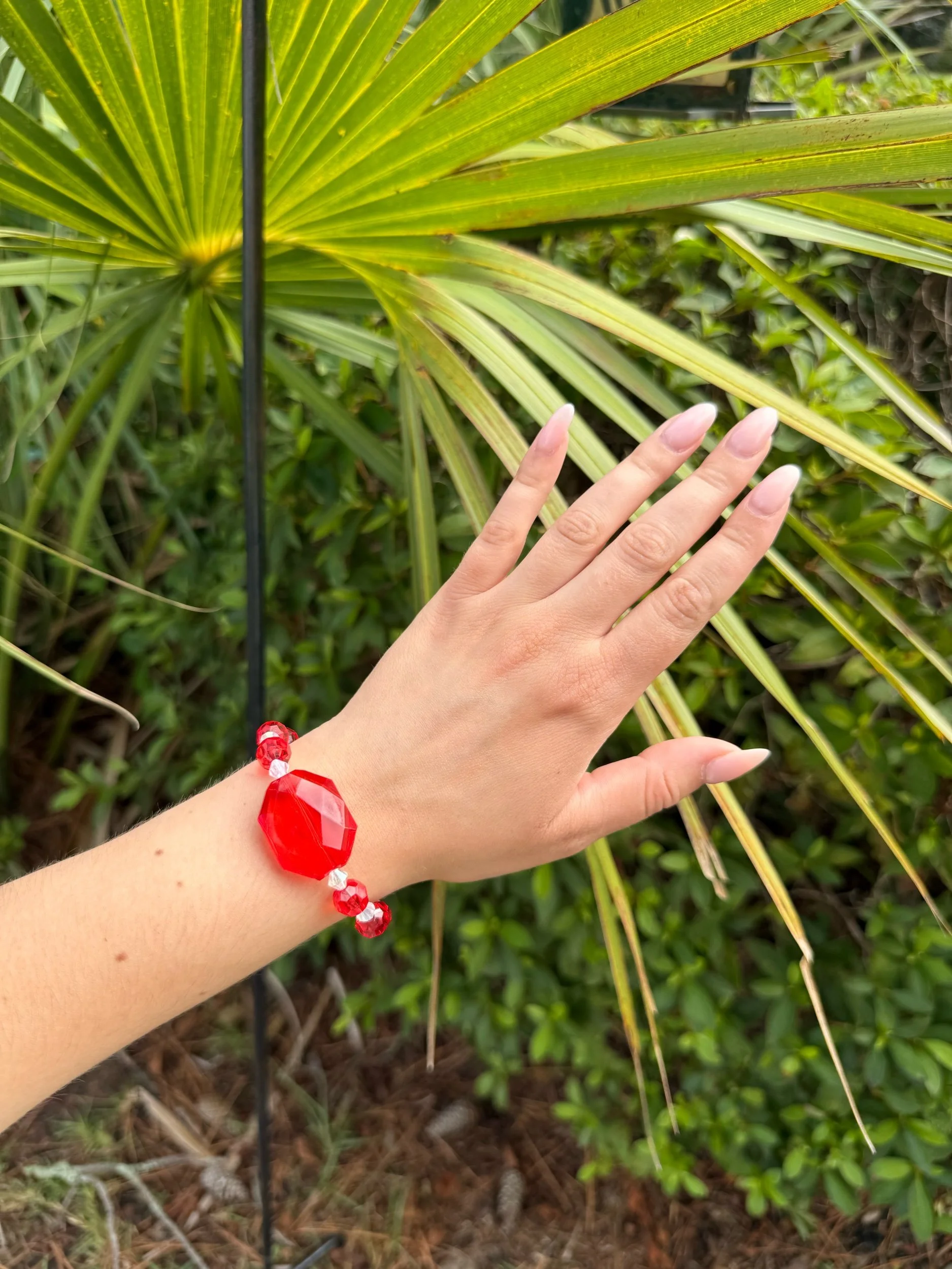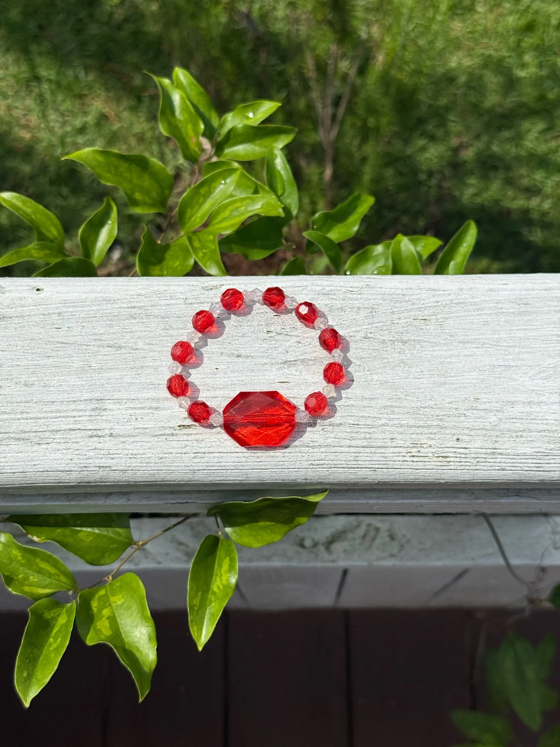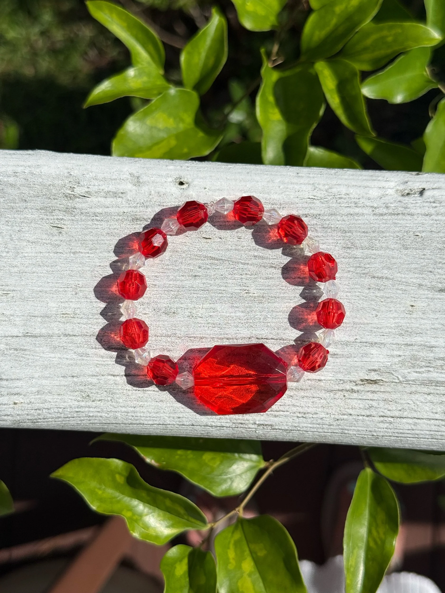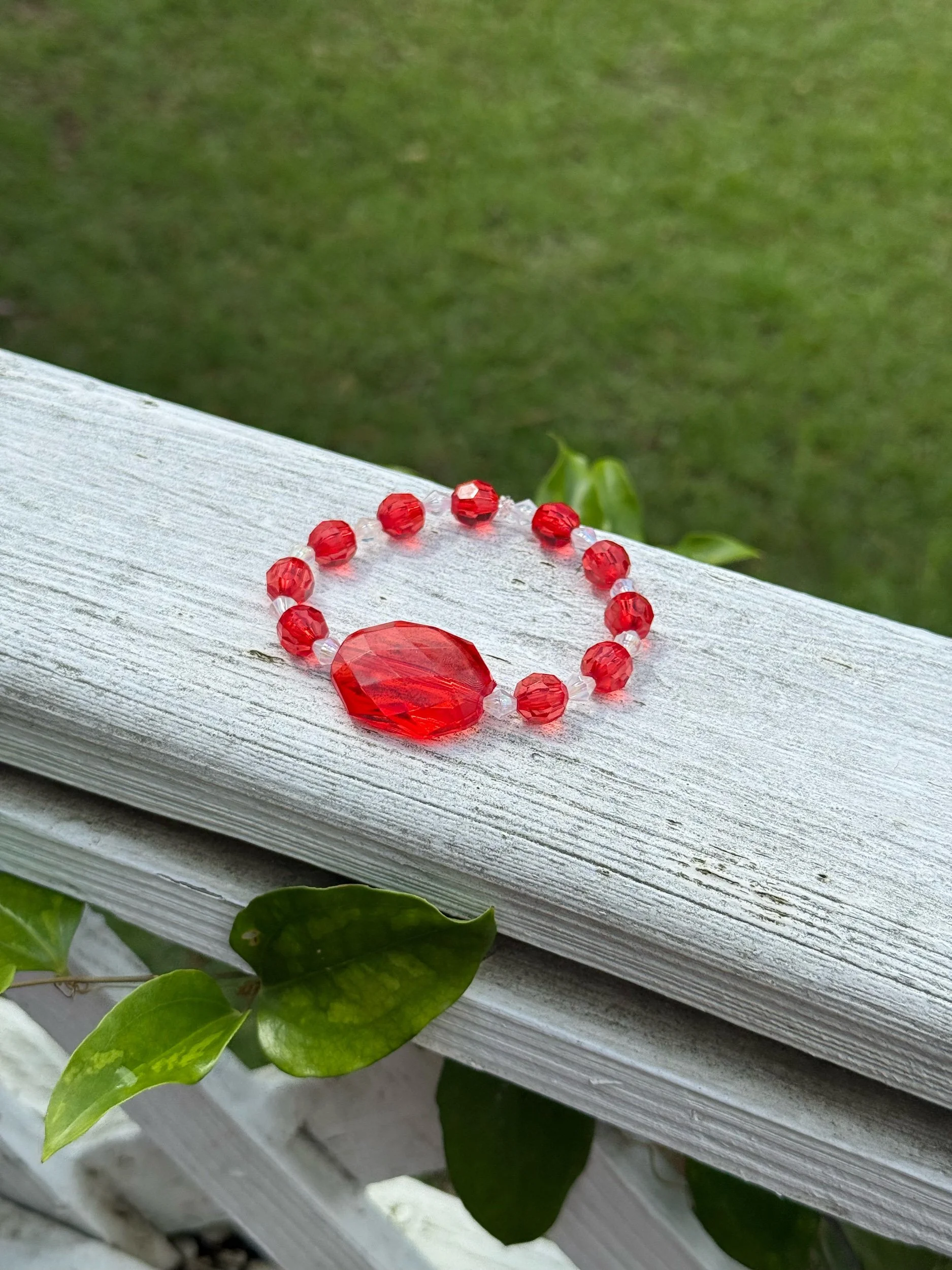 This one-of-a-kind bracelet features cherry red and shiny, (slightly holographic) clear acrylic beads, giving it a unique, eye-catching finish. Its stretch elastic design ensures a comfortable fit for any wrist size.