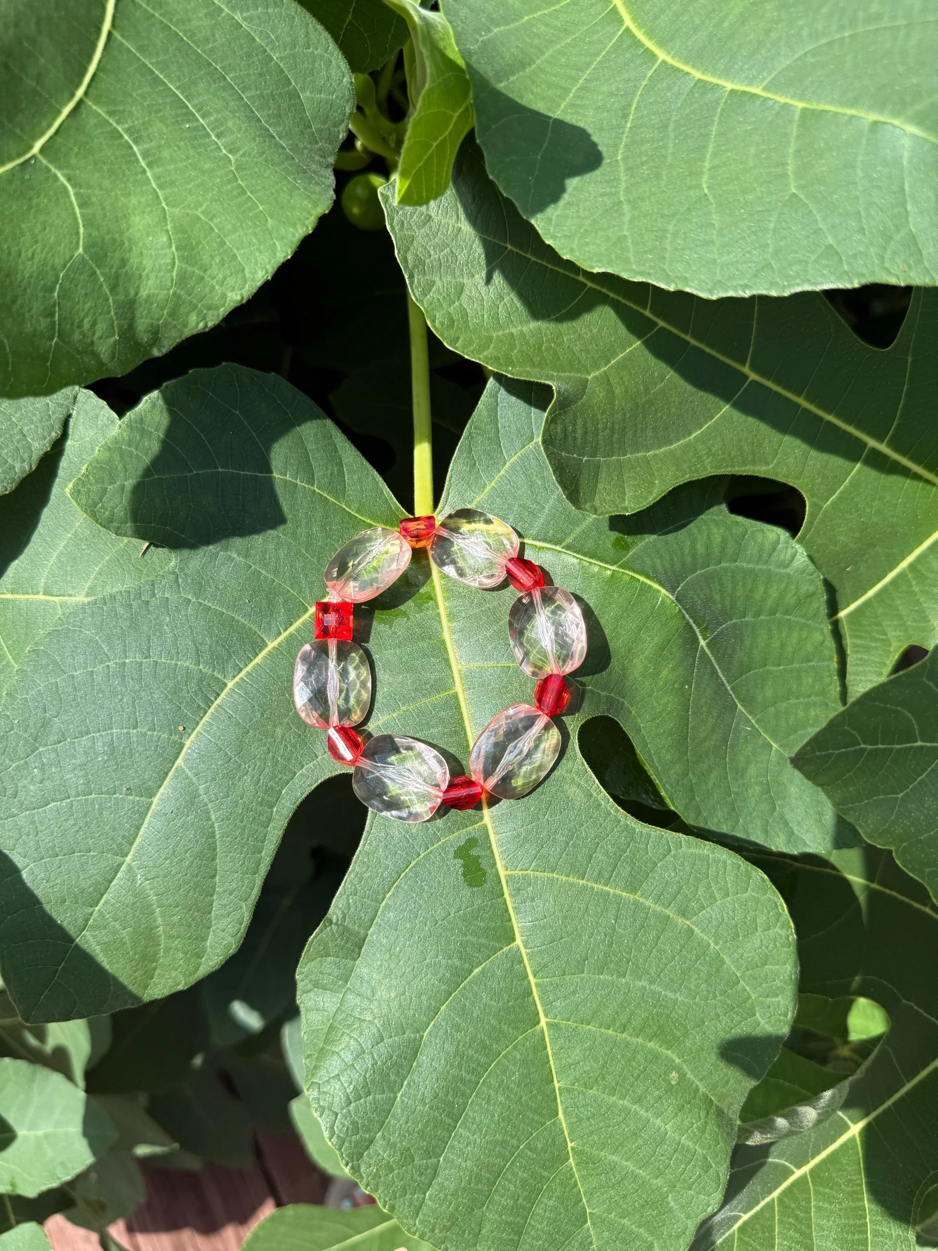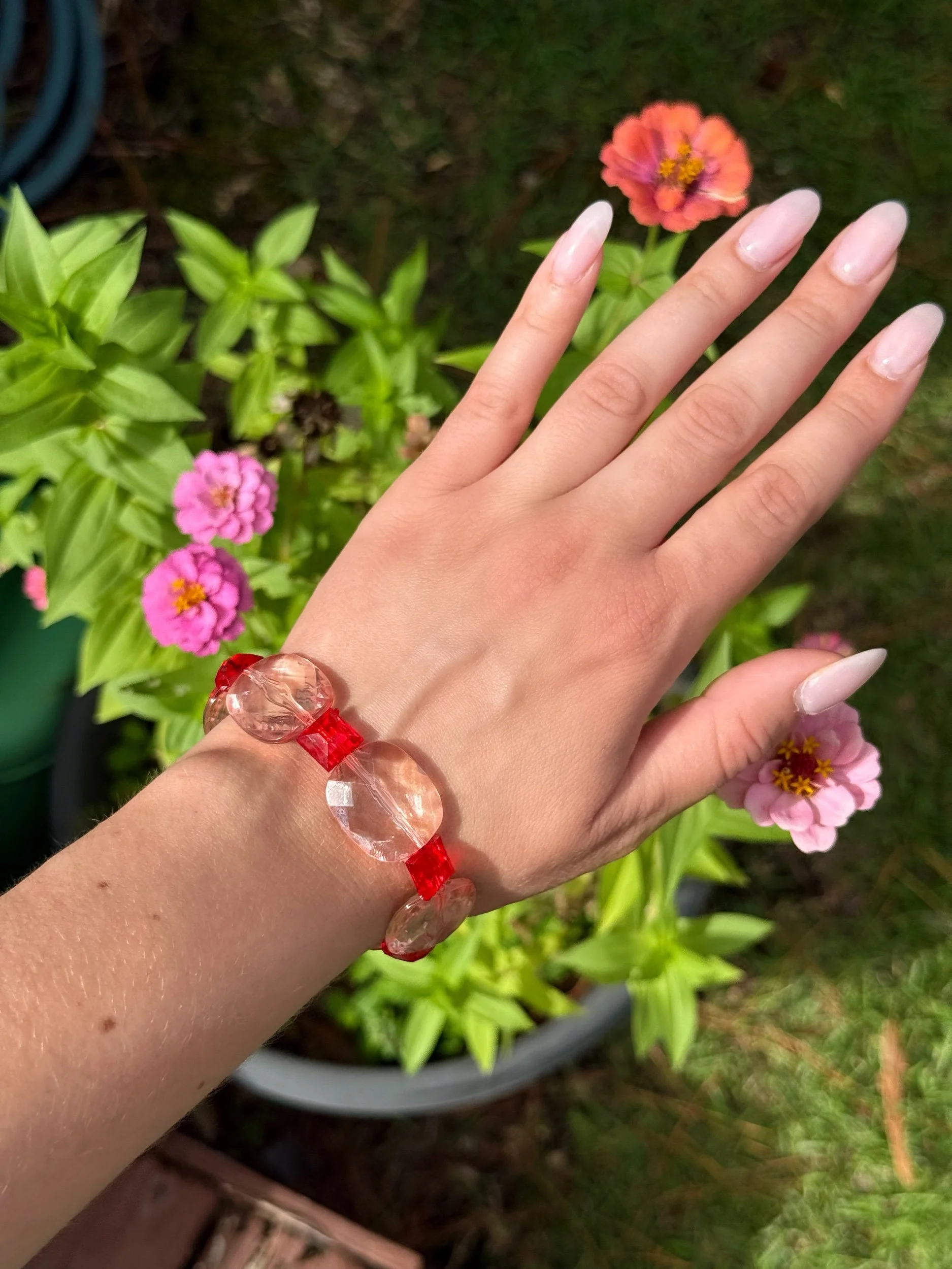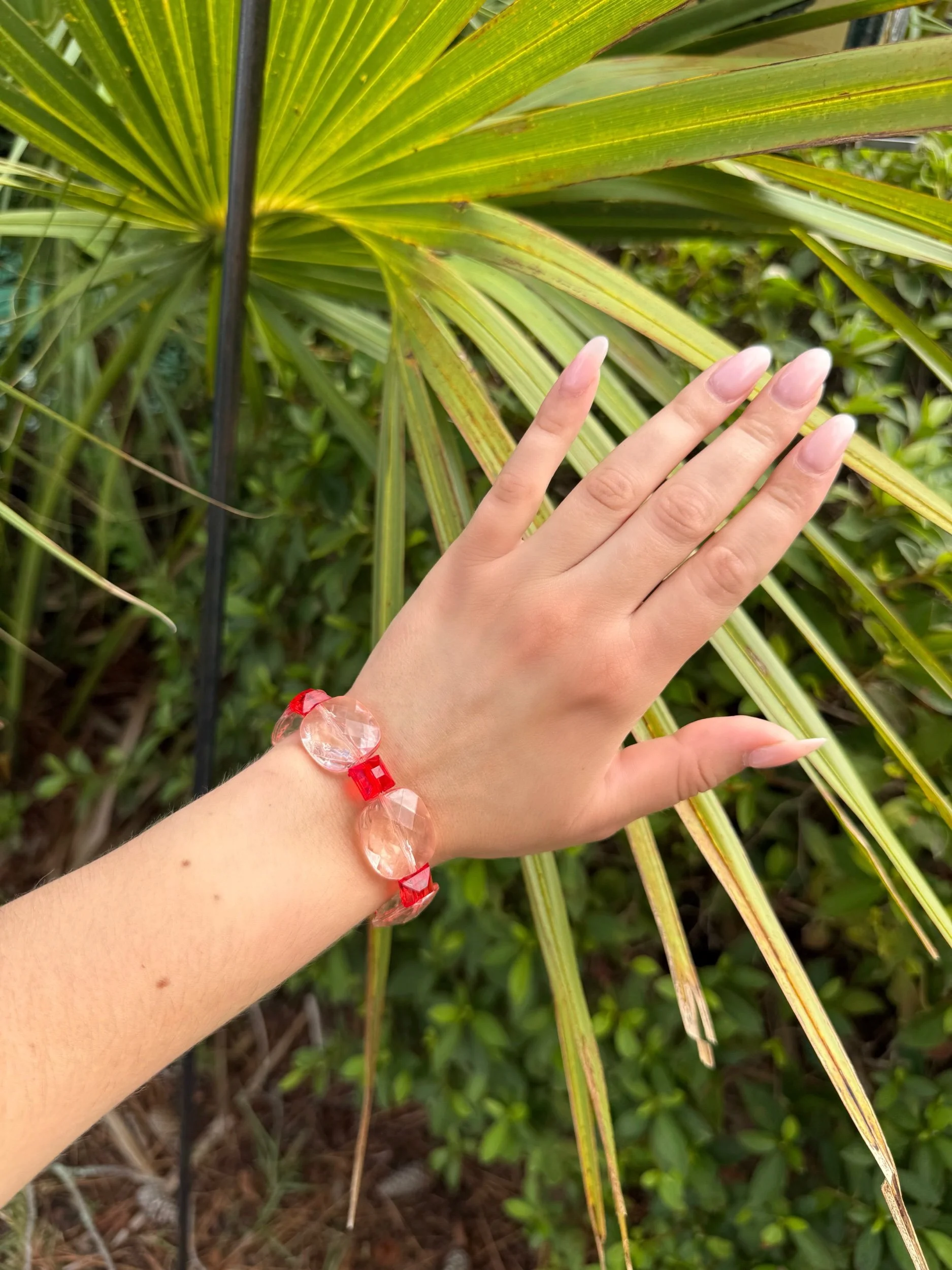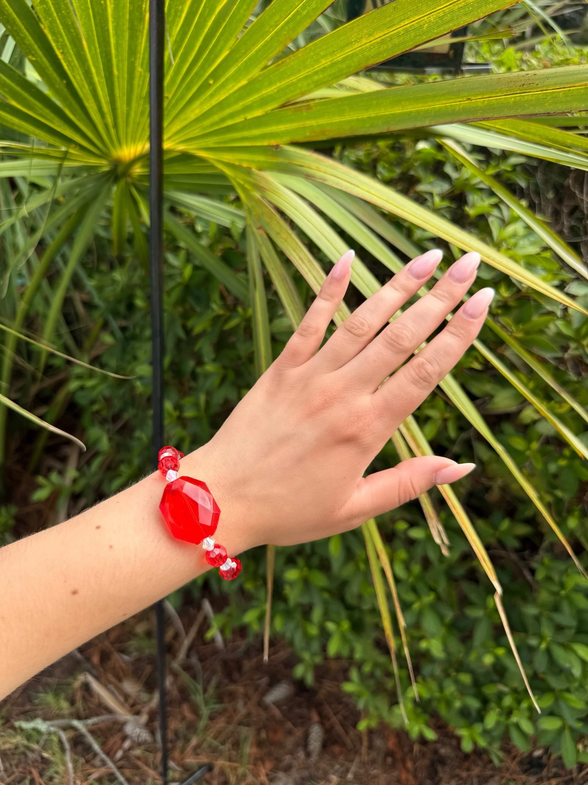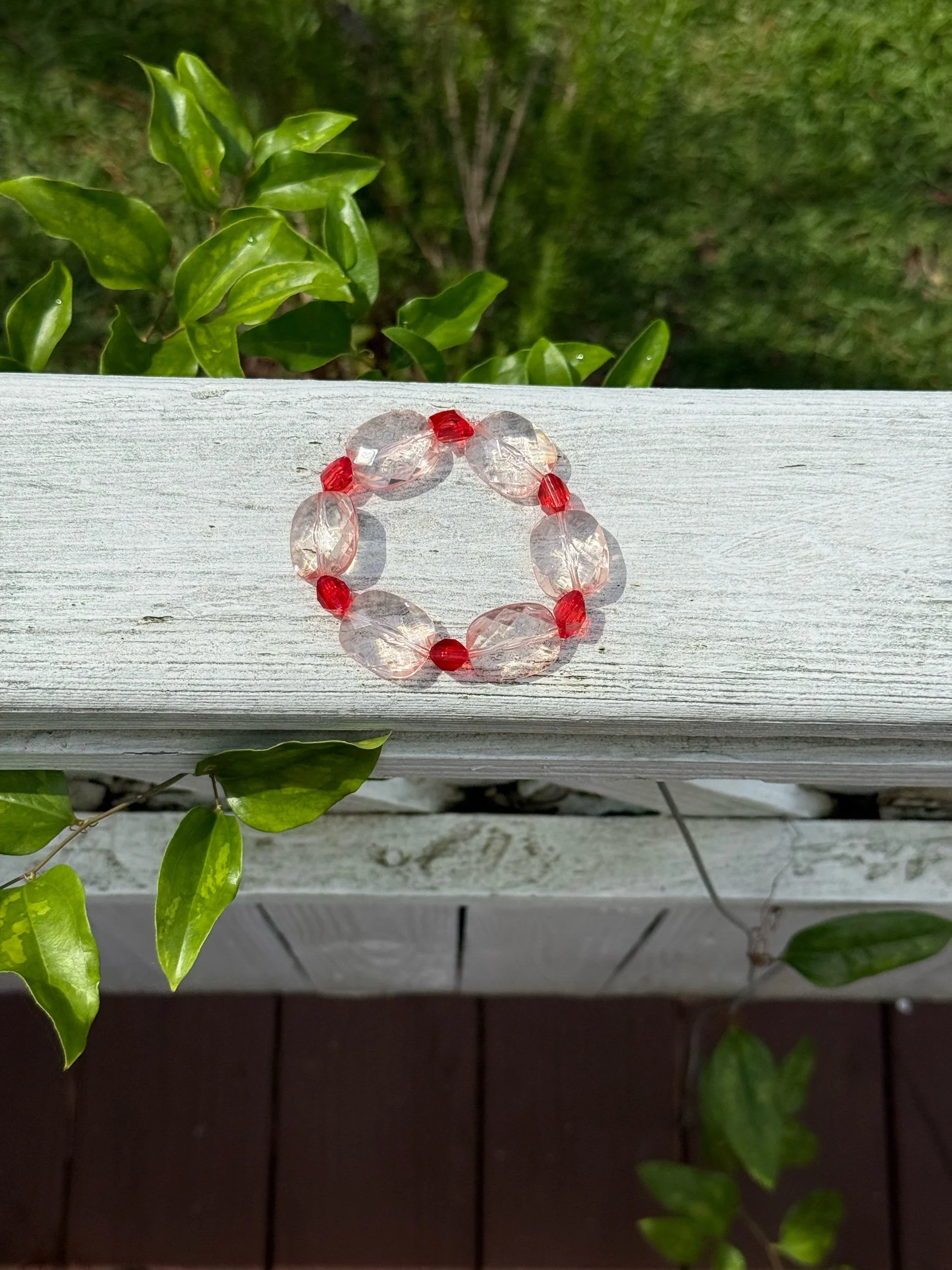 This one-of-a-kind bracelet features cherry red and shiny, (slightly holographic) clear acrylic beads, giving it a unique, eye-catching finish. Its stretch elastic design ensures a comfortable fit for any wrist size.